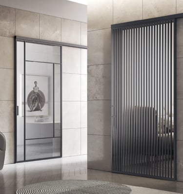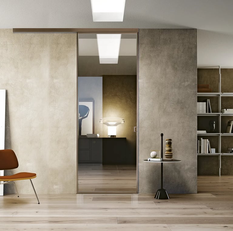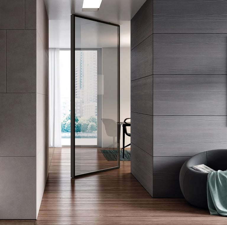 Le porte in vetro moderne non sono “solo vetro”: la differenza la fa il sistema. I profili in alluminio danno struttura, definiscono il disegno e permettono finiture molto attuali (dal look scuro e deciso alle versioni più neutre e luminose). Il risultato è una porta dal segno contemporaneo, perfetta per living, cucine, corridoi e studi.